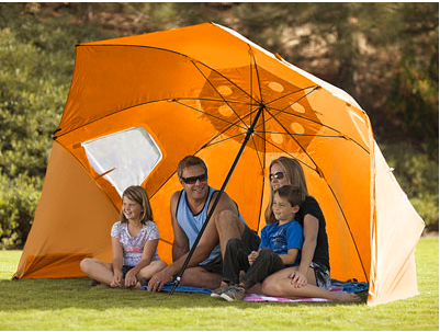 A beach umbrella, sun tent, rain shelter, and more all in one, the Sport-Brella gives you instant portable protection from the elements regardless of your activity. The Sport-Brella looks somewhat like a traditional beach shelter/umbrella, with a large canopy that shields an entire family or team while they lounge on the beach or hang out on the soccer sidelines.