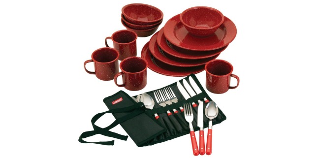 Today, you can score a really nice deal on this Coleman 24-Piece Enamel Dinnerware Set from Amazon.com!  This dishwasher-safe set includes four 10-in. plates, four 6-in. bowls and four 12-oz. handled mugs along with plastic-handled utensils in a roll-up storage pouch.