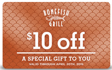 Through April 20th you can save $10 at Bonefish Grill! Head over here to print a coupon good for $10 off at Bonefish Grill (expires 4/20/15)! Note that this coupon excludes alcohol and is valid for dine-in only.