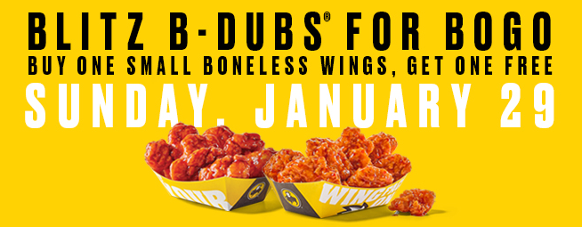 Head on over to your local Buffalo Wild Wings today and get a FREE Small Boneless Wings when you make a Small Boneless Wings purchase! This offer is valid for dine-in and takeout.