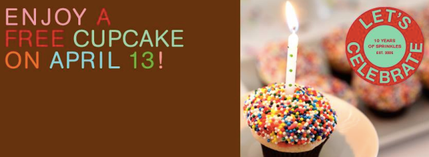 Monday, April 13th, Sprinkles Cupcakes is celebrating its 10 year anniversary by offering a FREE cupcake to every customer all day long! Visit the Sprinkles Facebook page for more information.