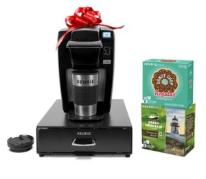 Included with this bundle (available in black or red) is a K15 brewer, Green Mountain Coffee Nantucket Blend 18-pk., Original Donut Shop Coffee 18-pk., 12-oz. travel mug and a 35-ct. storage drawer.