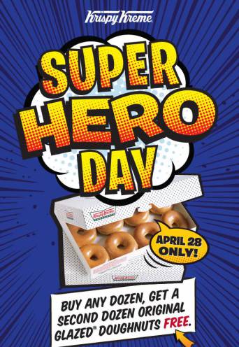 In honor of National Super Hero Day on April 28th, participating Krispy Kreme stores are offering up one dozen FREE Original Glazed Doughnuts whenever you purchase one dozen – no coupon required. Go here for more details.