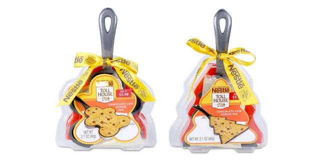 This Nestle Toll House Cookie Skillet Set includes two reusable holiday shaped cast iron skillets – one Christmas Tree and one Gingerbread Man plus, Nestle Toll House chocolate chip cookie mix.