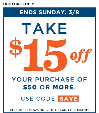 And today, 3/8 you can take $15 off your purchase of $50 or more for in-store purchase (excludes today-only deals & clearance). Use code SAVE.