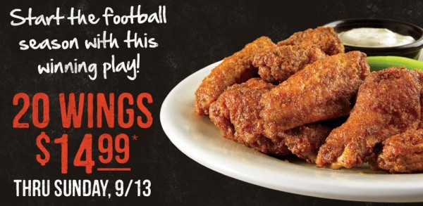 Outback Steakhouse: 20 wings for $14.99 through 9/13 for dine-in or Curbside Take-Away.