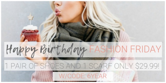 This weekend, Cents of Style is celebrating their 6th birthday of Fashion Friday by offering a pair of their favorite shoes and one of their best selling scarves for ONLY $29.99! You can choose from over 30 different pairs of shoes!