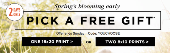 Through tomorrow, Shutterfly is offering ONE of two gifts completely FREE!  You can choose a FREE 16X20 Photo Print (a $17.99 value!) OR 2 FREE 8X10 Photo Prints (a $7.98 value!) when you use the promo code YOUCHOOSE at checkout! Shipping will be $4.99 for the 16X20 print and $2.99 for the 8X10 prints.