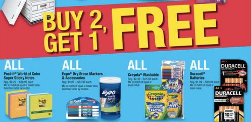 * EXPO Dry-Erase Markers & Accessories $3.89-$24.99 * Crayola Washable Markers $2.39-$15.99 * Duracell Batteries $1.99-$39.99 * Place Heavy Duty Binders $7.49- $32.99 (Also note that there is a $0.25/1 Duracell Coppertop, Quantum, Ultra Photo Lithium, Specialty Batteries, Rechargeable Batteries, Charger or Hearing Aid Batteries coupon found in the 7/5 PG)