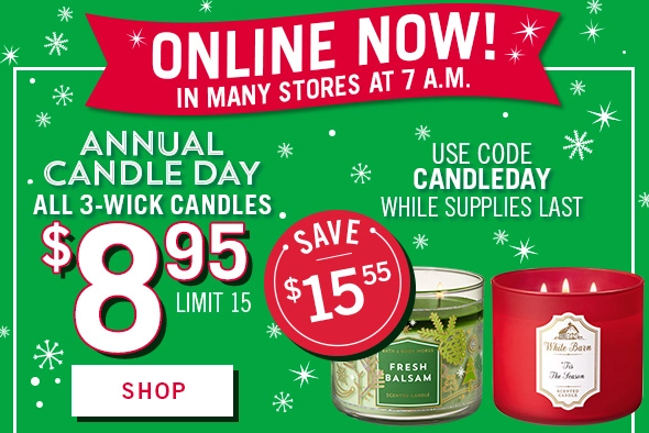 Today only Saturday, December 1st, Bath & Body Works is offering ALL 3-wick candles for $8.95 each (regularly $24.50). This offer is available online with coupon code CANDLEDAY and all day in your local store.