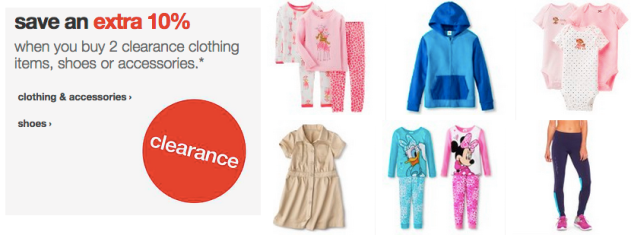 Through 4/11, Target.com has an additional 10% off when you purchase TWO Men’s, Women’s or Kids’ Clearance clothing, shoes or accessories (discount automatically applied at checkout). If you are a Target REDcard holder, you’ll snag an additional 5% off your order AND get FREE shipping to home (no minimum!). Or you may be able to opt for FREE in-store pickup (IF available at a Target near you); otherwise, shipping is free with a $25 order.