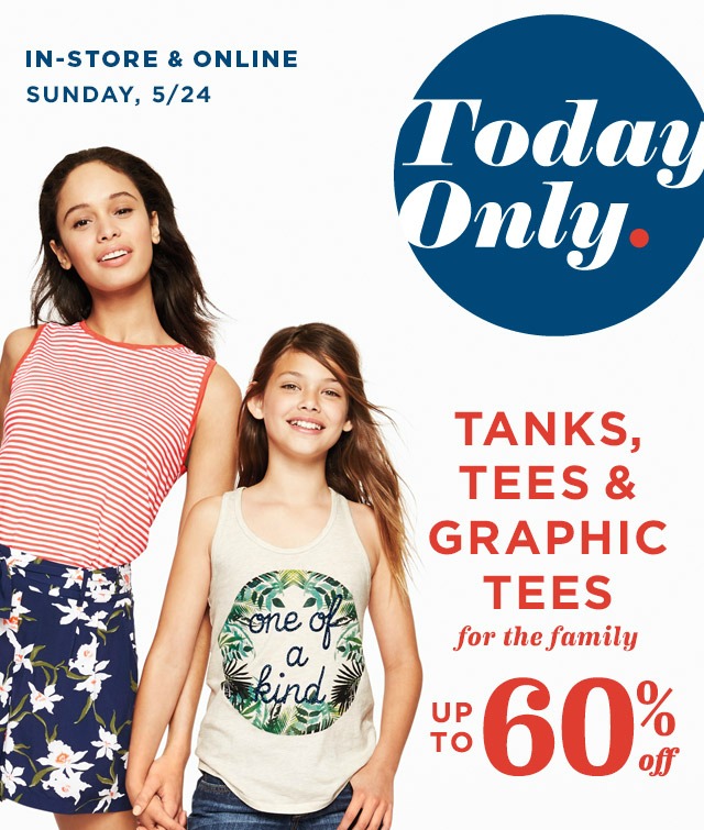 Old Navy is offering tanks, tees & graphic tees for the family at up to 60% off today only! This deal is available online and in-stores! I found some tanks starting at just $4! Plus, take an extra 30% off (no promo code needed) your order! (this excludes everyday steals, hot deals and clearance)