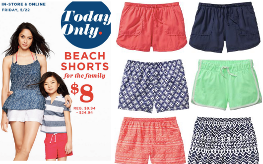 Need some new shorts for the beach? Then head over to Oldnavy.com where for today only you can get Beach Shorts for the Family for only $8 (regularly $9.94-$24.94!) both in-store and online! (limit of 5 per customer)