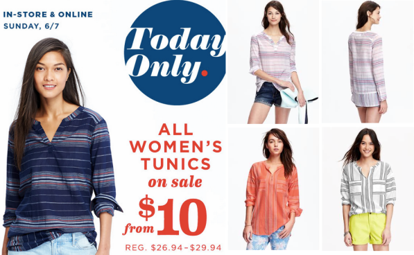 Today only, Old Navy is offering ALL Women’s Tunics for only $10 (regularly up to $29.94!) valid both in-store AND online! Limit of 5 per customer. And, also for today only, you can receive 35% off your entire purchase with the code FORYOU (not valid on Everyday Steals, Hot Deals, Today Only Deals, and Dresses and Skirts merchandise). Shipping is free on orders of $50 or more.