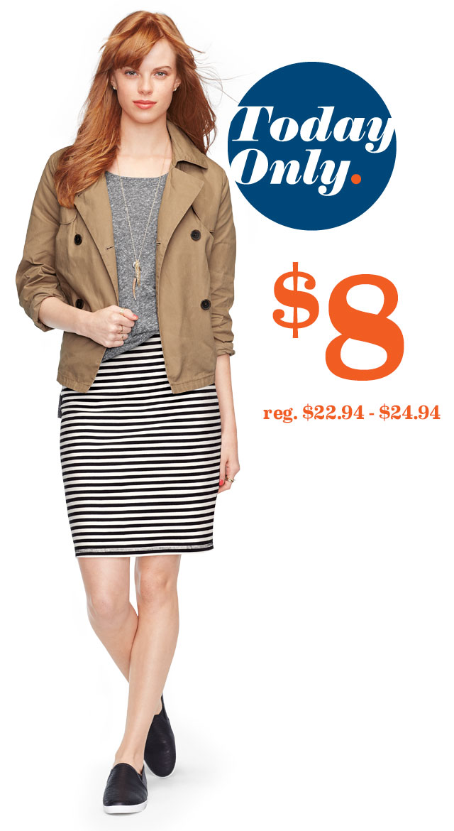 Today, March 11th only, visit your Old Navy store where you can get Old Navy Pencil Skirts for Women for just $8 (regularly up to $24.94!). This is valid in-store only for select styles. And for today only, you can save an additional 30% off all purchases at Oldnavy.com – no promo code needed (some exclusions apply)!