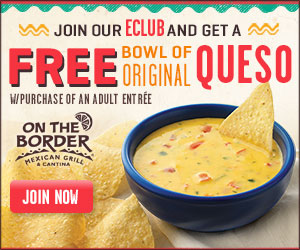 On the Border Mexican Grill & Cantina – Sign up for Club Cantina to receive a coupon good for a FREE bowl of original queso or sopapillas with purchase of an adult entree! On the Border Mexican Grill & Cantina locations here.
