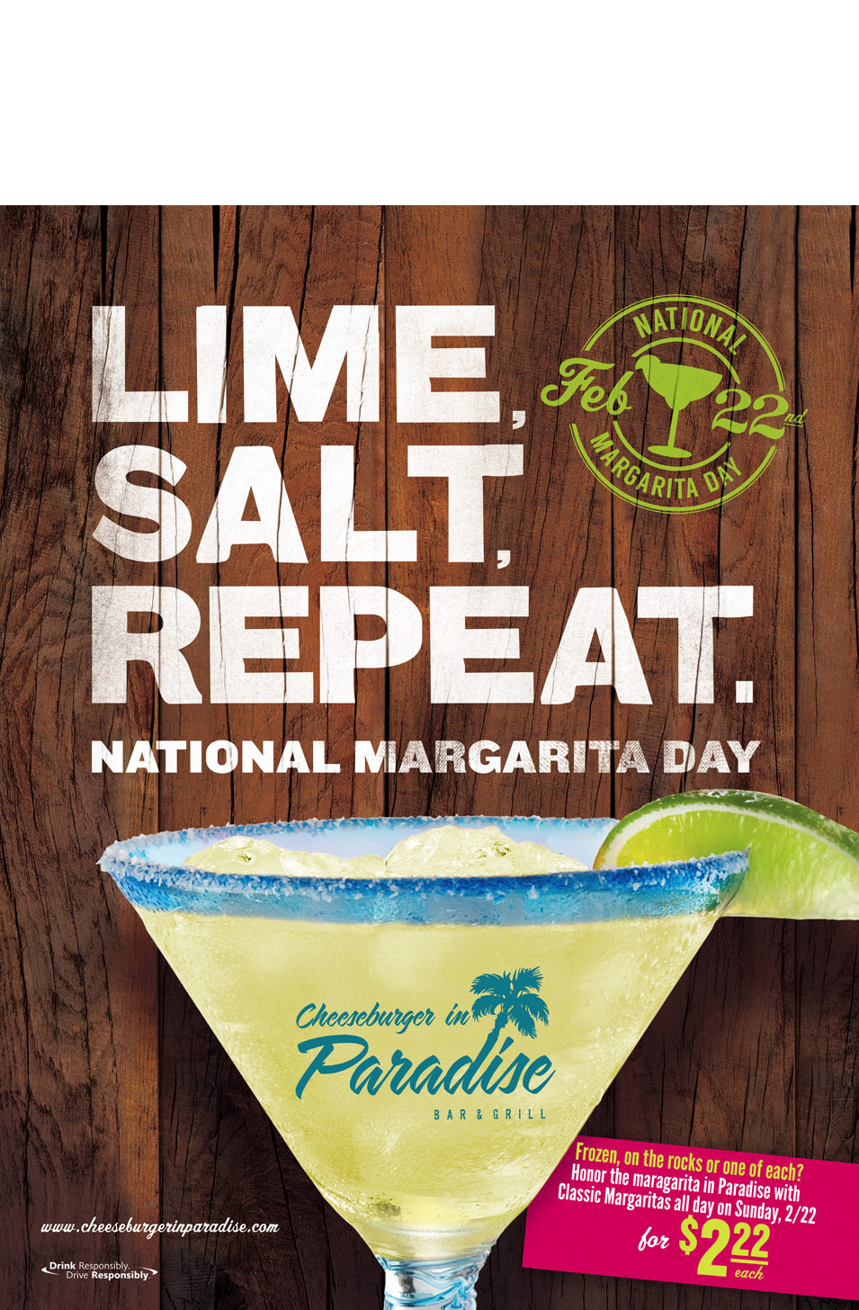 Cheeseburger in Paradise Enjoy a Classic Margarita for $2.22 all day long on Sunday, Feb. 22, 2015. More info here.