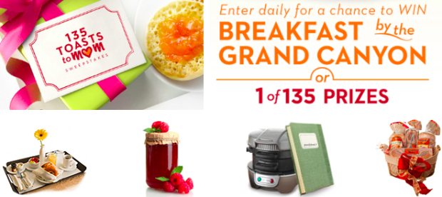 Enter the Thomas’ English Muffins and Bagels “135 Toasts to Mom” Promotion – through May 10th and you’ll have a chance to instantly win one of 4,725 coupons valid for a FREE package of Thomas English Muffins or Bagels – $5 value! There is also the chance to instantly win 1 of over 135 instant prizes!