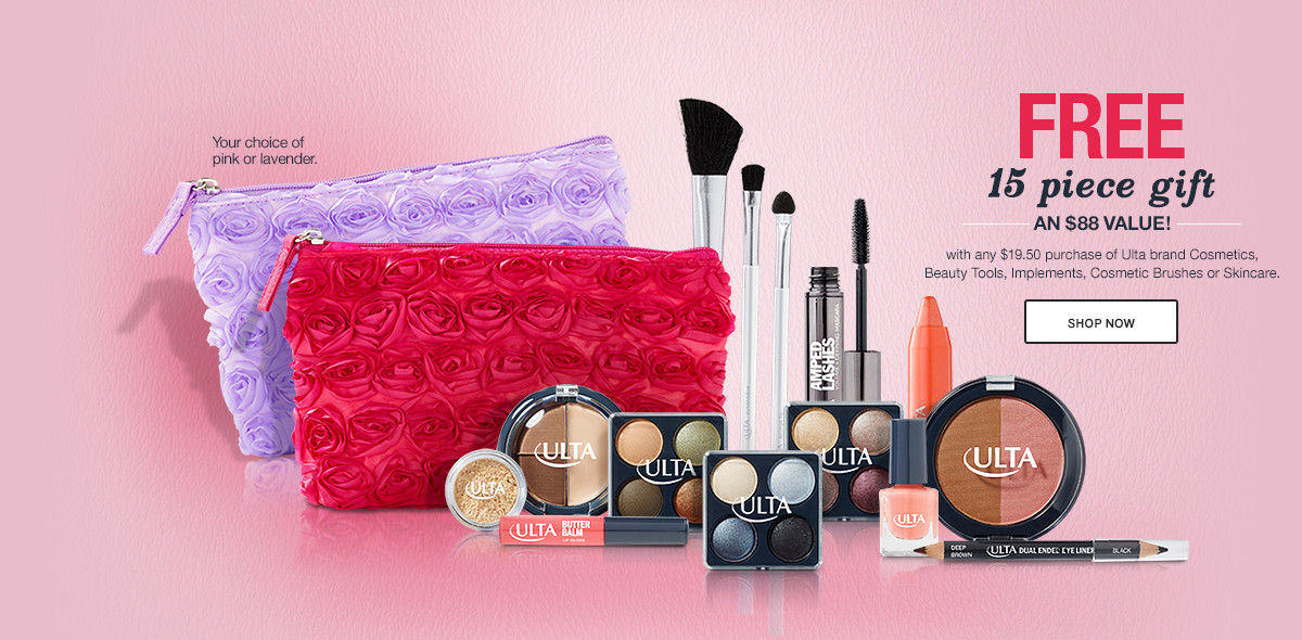 Head over to ULTA and purchase $19.50 ULTA Cosmetics, Beauty Tools, Implements, Cosmetic Brushes, or Skincare items (offer valid 2/15/15-3/14/15 or while supplies last) and receive a FREE ULTA 15-pc gift – worth $88!!