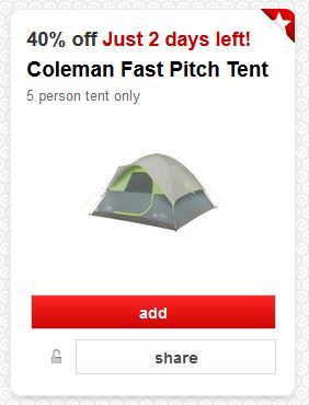 If you are planning on camping soon, be sure to add this Target Cartwheel offer for 40% off this Coleman Fast Pitch Tent (5 person tent only). This expires on 8/22. This tent is priced around $109.99 so only $65.99 after using this Cartwheel offer!