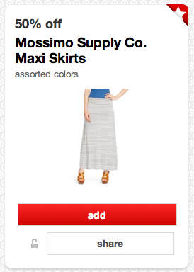 target maxi skirtsThere is a new Cartwheel Savings offer valid for 50% off Mossimo Supply Co. Maxi Skirts (excludes clearance)!  Check out the great deal you can score at Target: