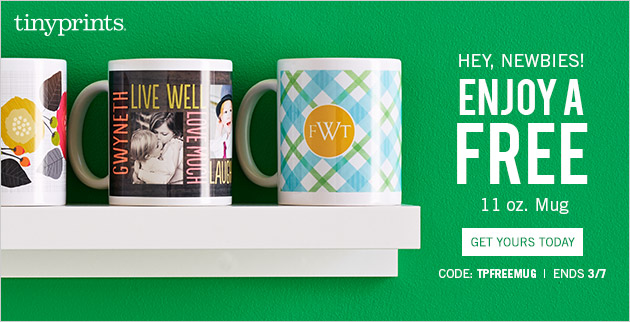 This deal ends today – An awesome deal is available from Tiny Prints through March 7th! Tiny Prints is offering one free mug with a $1 minimum purchase!  All customers are eligible to receive a FREE 11 oz. white mug with a $1 minimum purchase, or credit of $15.99 towards any color or size upgrade. Just use the promo code TPFREEMUG at checkout to score this awesome deal!