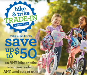 Now through April 4, ToysRUs is hosting a Bike or Trike Trade In event! Save up to $50 on ANY bike or trike when you trade in ANY used bike or trike. This offer is valid in store only. For more info click here.