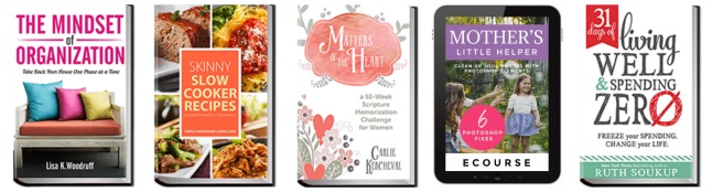 These top-quality resources cover everything you need to make homemaking and mothering feel less stressful… quick & healthy recipes, homemaking printables, cleaning tips, sizzling date night ideas, parenting helps, and so much more.