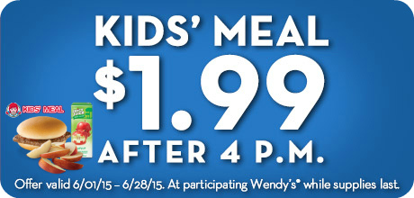Until June 28th, Wendy’s is offering Kid’s Meals for only $1.99 each after 4PM at participating Wendy’s locations! Be sure to check with your local restaurant to be sure they are offering this deal.